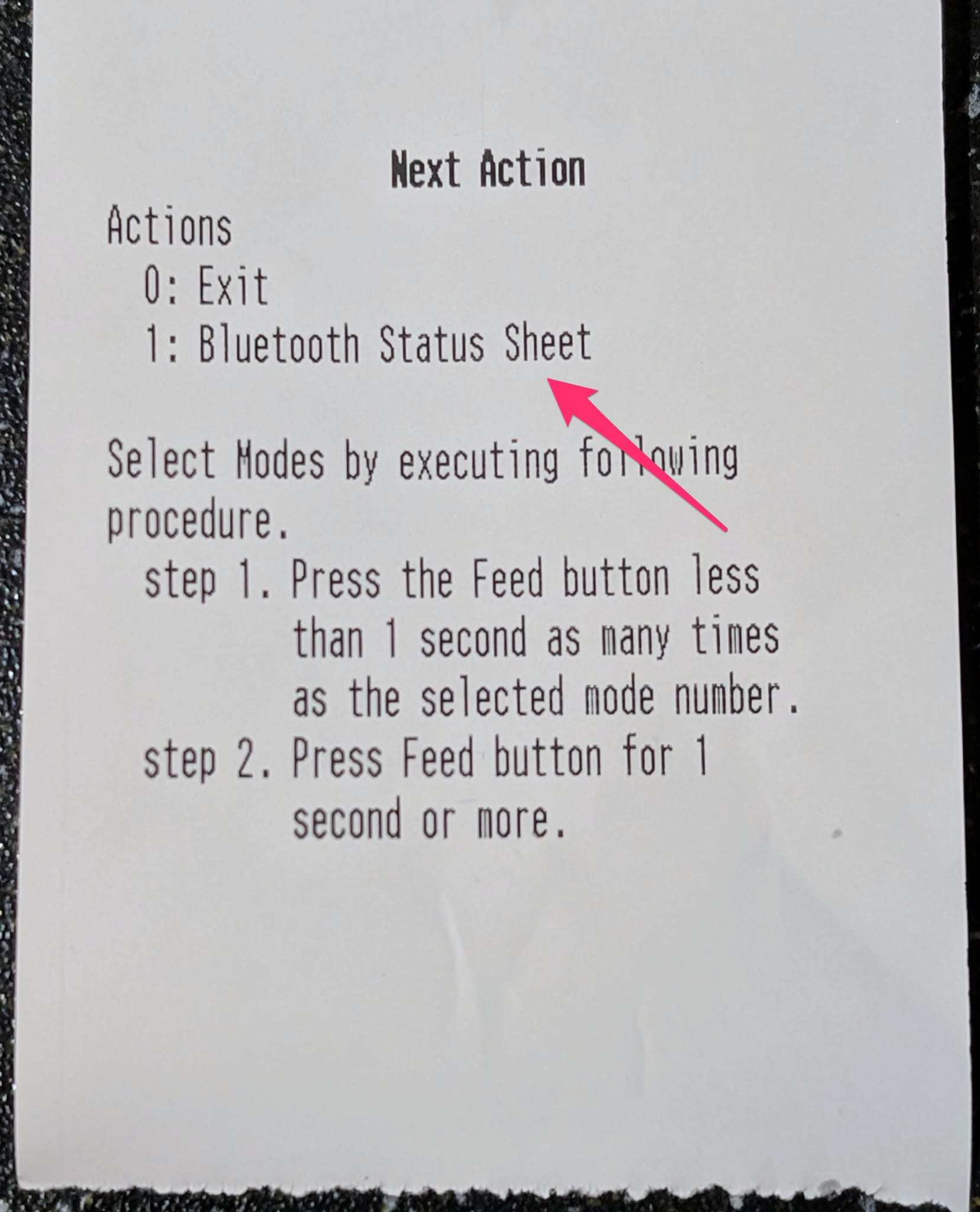 ➡️ Erst nach Auswahl von „1 – Bluetooth Status Sheet“ befindet sich der Drucker im Bluetooth-Pairing-Modus